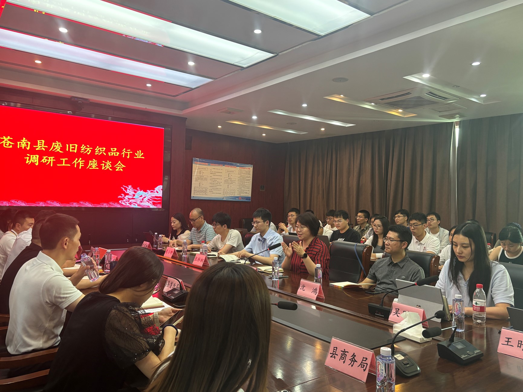 7月8日下午,调研团与苍南县、望里镇、宜山镇、钱库镇、纺织行业协会等相关政府部门和再生纺织业企业代表等进行座谈,与会师生和政府部门负责人、企业家代表进行了热烈讨论,从宏观角度充分了解苍南纺织业发展现状和面临的挑战,并就企业对外投资现状、未来发展规划、产业转型升级等议题展开交流。同时,双方还就如何通过国际三方合作推动苍南可再生纺织业“走出去”,提升国际竞争力,并向全世界讲好苍南的低碳减排故事进行了深入探讨和交流。
